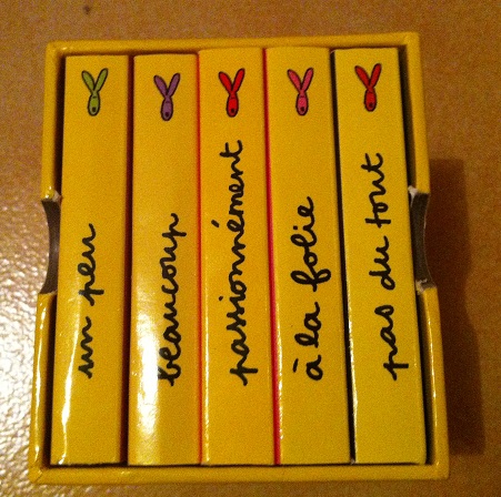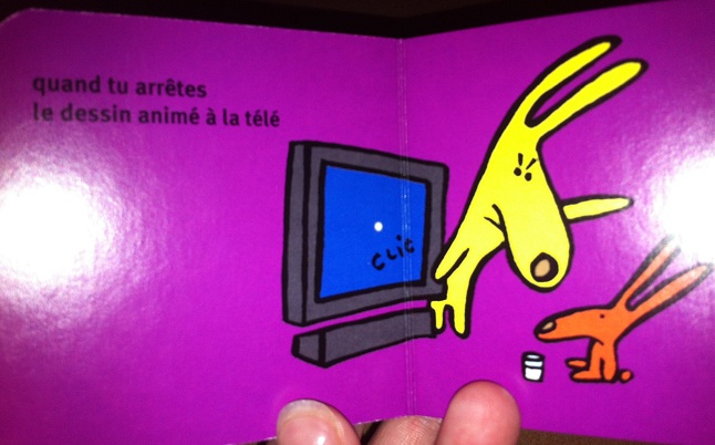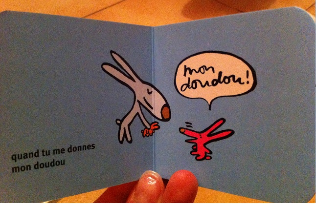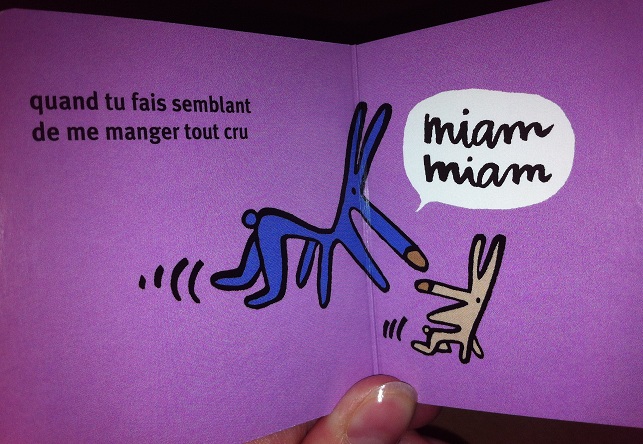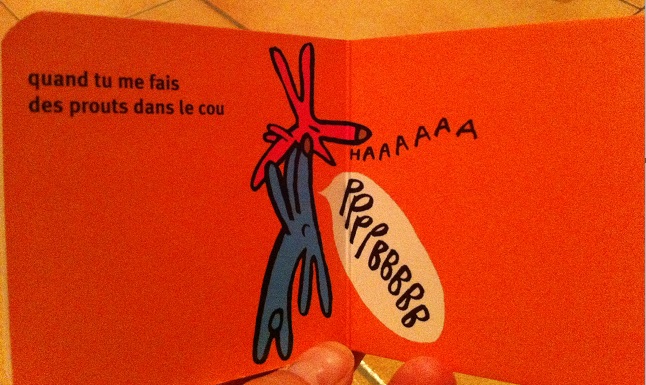 Les petits livres font 8 cm par 8 cm environ et ils contiennent sept petites phrases chacun comme ci-dessus. Entièrement cartonnés, la prise en main est assez facile. Dessins très simples et rigolo.